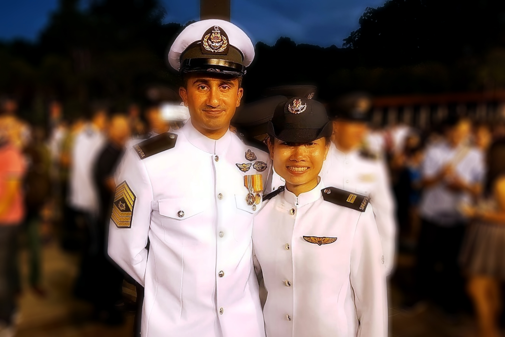 Dan semasa dia berada di Sayap Udara di OCS, saya juga berada di Sayap Pegawai Kadet Kanan yang terletak bersebelahan, menjalankan kursus sebagai Pegawai Waran Kursus. Oleh itu di majlis perkahwinan kami, saya terpaksa mengumumkan kepada rakan sekerja dan komander SAF kami bahawa kami tidak berkenalan semasa dia seorang kadet di OCS!
