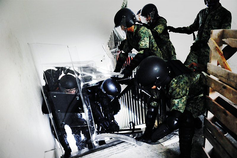 To detain and control personnel who have gone AWOL (Absent Without Official Leave) as well as rioters within camps, MPs have to undergo the anti-riot training programme. Decked in black polymer-plastic suits from head to toe, and carrying their batons and shields, these guys are not to be trifled with.