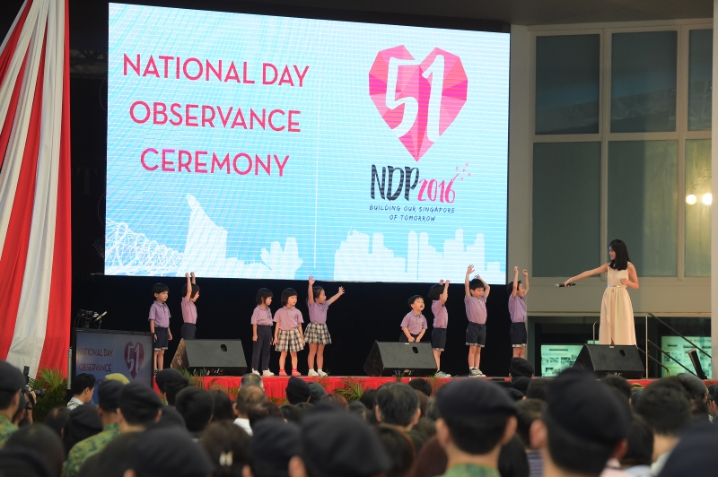 At the ceremony, artistes from the SAF Music and Drama Company and children from Cherie Hearts @ Gombak put up a heart-warming performance in line with this year's National Day Parade theme, Building Our Singapore of Tomorrow.