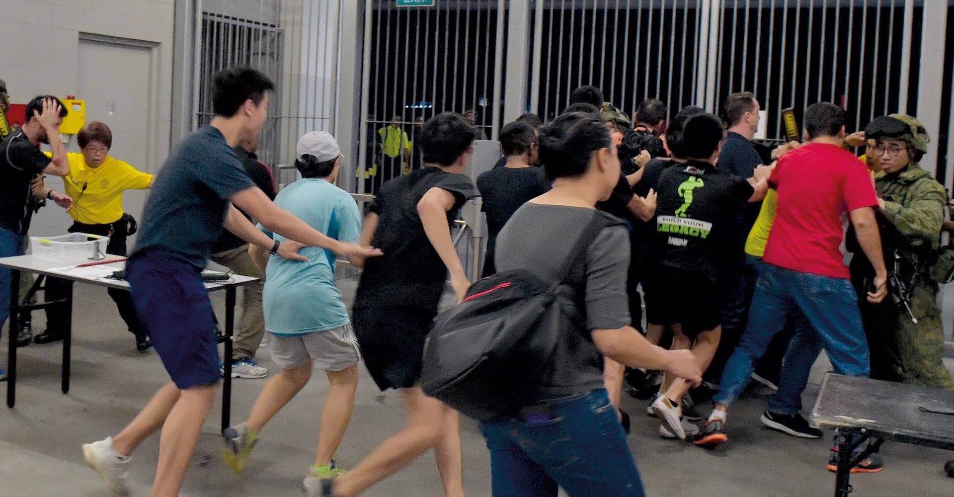 In the early hours, drama erupts as a panicked crowd tries to flee from the attack. Sports Hub staff and SAF soldiers hold them back, screening each one thoroughly. One of the civilians does not seem to be at ease, and initial security scans indicate that he may have a weapon hidden on his body.