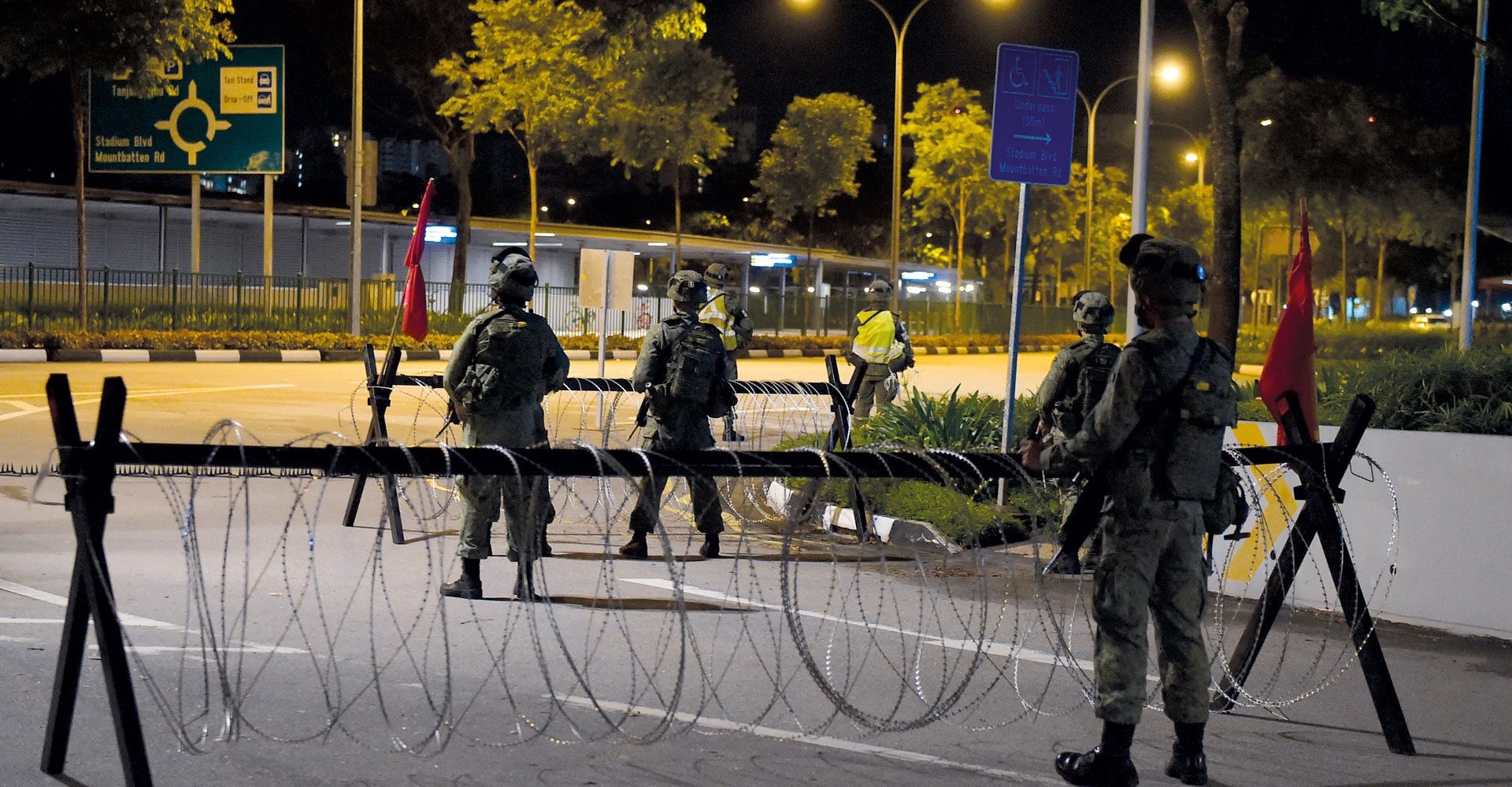 The soldiers move quickly, establishing personnel and vehicle checkpoints around the Sports Hub. All persons and vehicles going into and out of the premises are subjected to stringent checks.