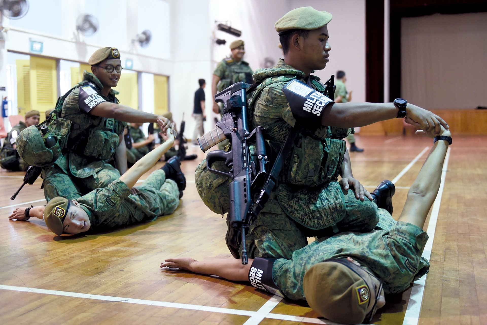 Unbeknownst to them at the time, it would be a part of a massive mobilisation and equipping exercise spanning two days. On the same day, an elite infantry unit — 3rd Battalion, Singapore Guards — has also been activated at Bedok Camp, and guardsmen are running through their drills. These include baton techniques and restraint manoeuvres.