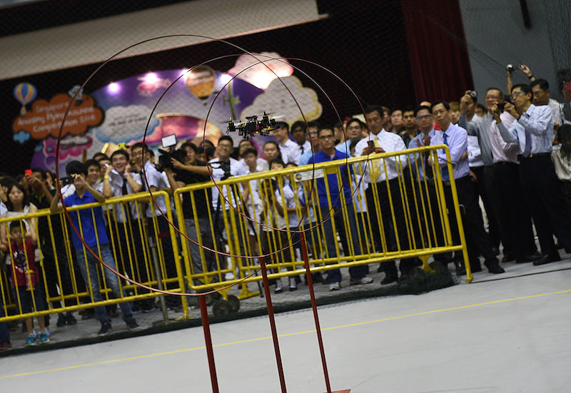 The three-man SUTD team's machine was the fastest in the mission where it had to fly through a row of pylons, burst a balloon and land in a 2m-by-2m box.