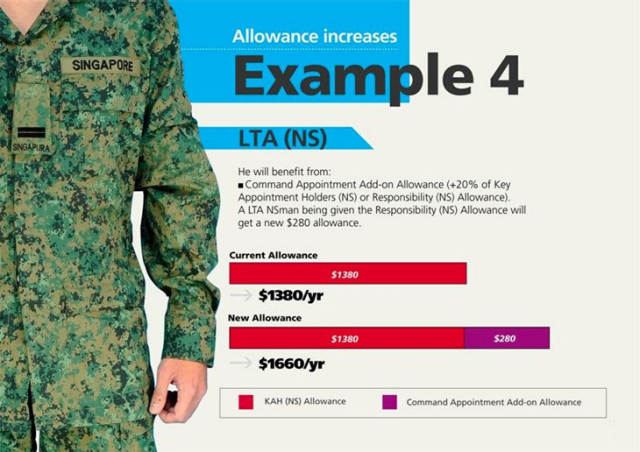 In recognition of their heavier responsibilities, NS command appointment holders will also be given a 20 per cent add-on allowance on top of their command appointment allowances.