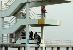 A group of hostages are being held by armed terrorists at a tower beside a pier. Without warning, naval divers emerge from the water and swiftly charge up the tower. A round of gunfire rings out and in less than a minute, the hostages are rescued as the naval divers successfully negate the terrorist threat.