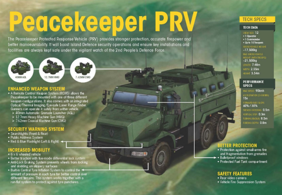 Said Commander 2 PDF Comd Brigadier-General (BG) Terry Siow of the Peacekeeper's enhanced capabilities: "The new PRV allows soldiers to be better protected and because of its enhanced mobility, is able to bring the soldiers to the objective faster. With the weapons system on board, which is remote-controlled, it allows our soldiers to be able to deal with threats that come their way much better than the V200."