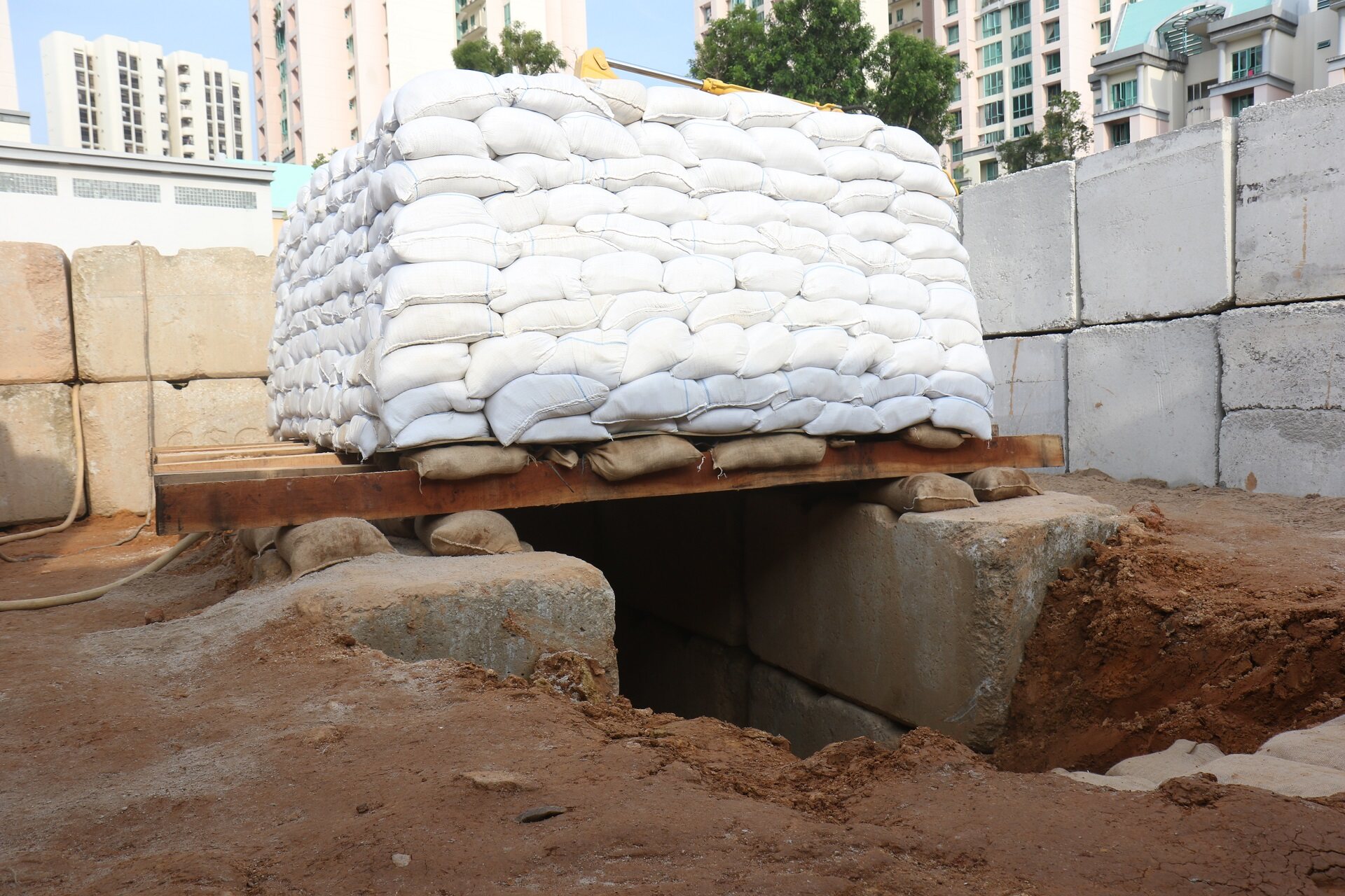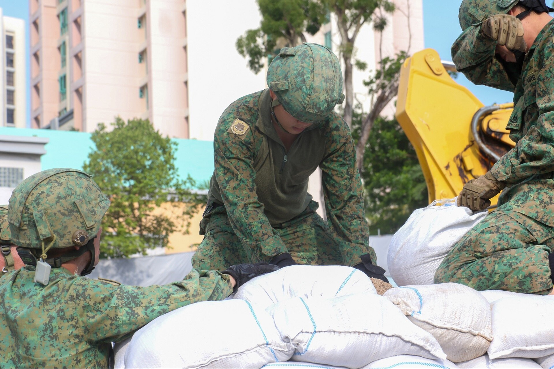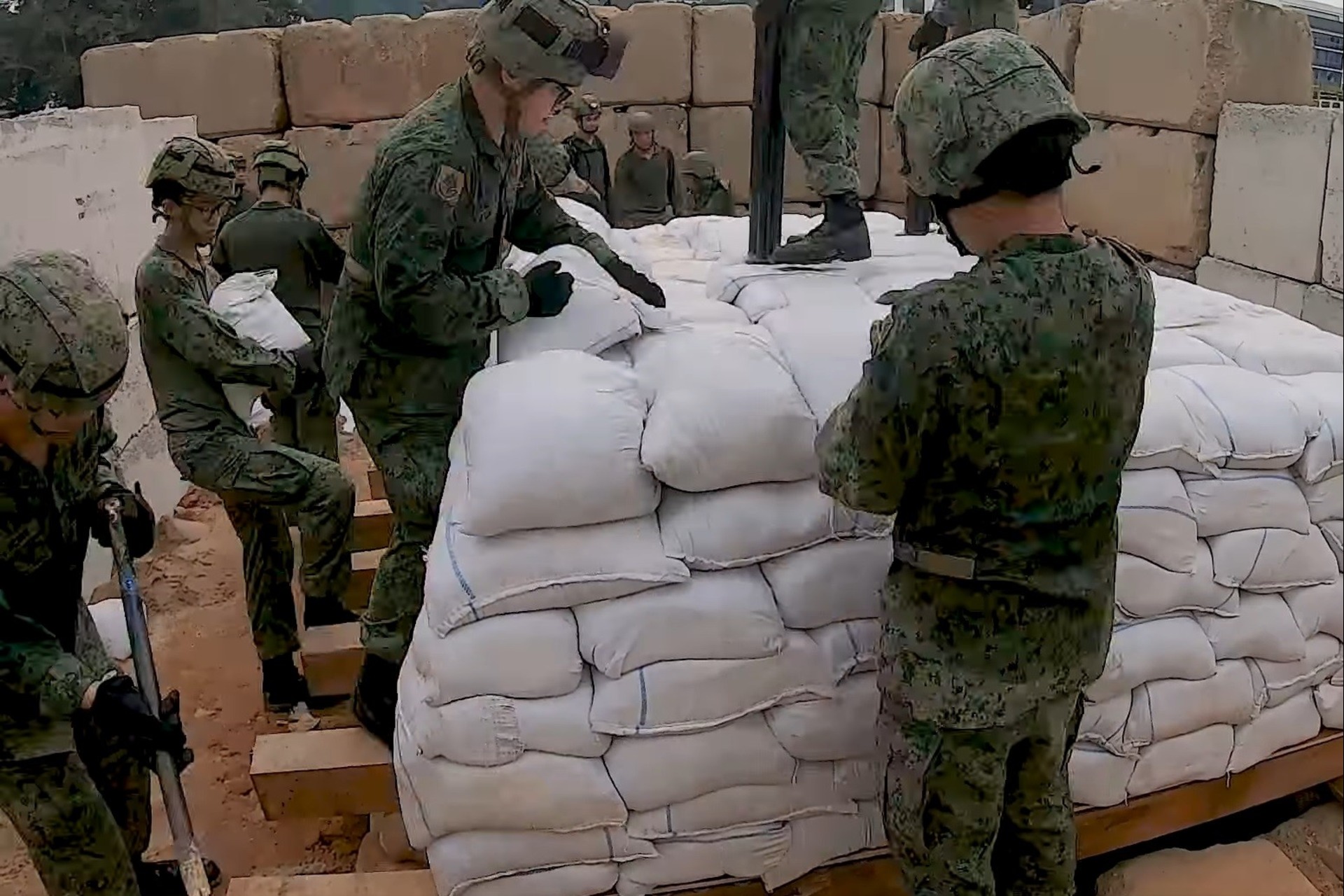 Pasukan SAF EOD memastikan beg pasir dipadatkan dengan betul.