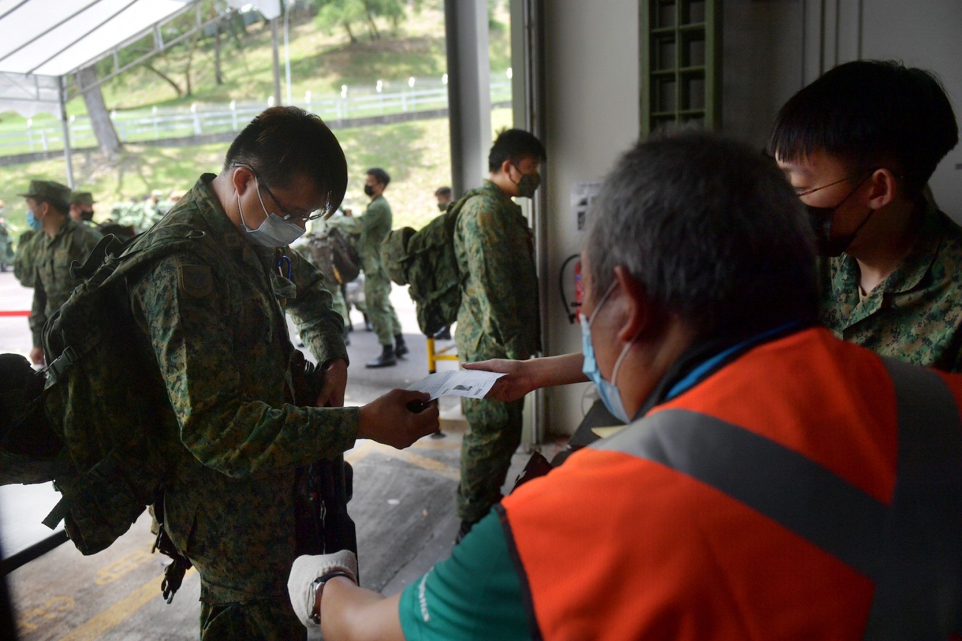Anggota Perkhidmatan Negara melaporkan diri dengan beramai-ramai di Kem Maju, membuktikan keghairahan mereka untuk mempertahankan Singapura, kata Pegawai Pemerintah Batalion ke-795, Pengawal Singapura (795 Gds), Leftenan Kolonel (LTC) Mohammad Jawahir Bin Samuri.