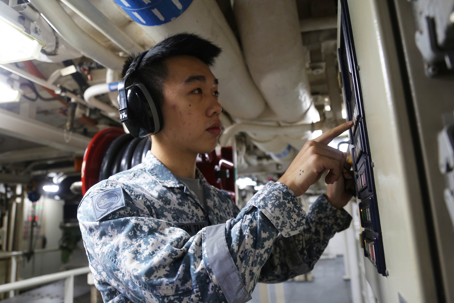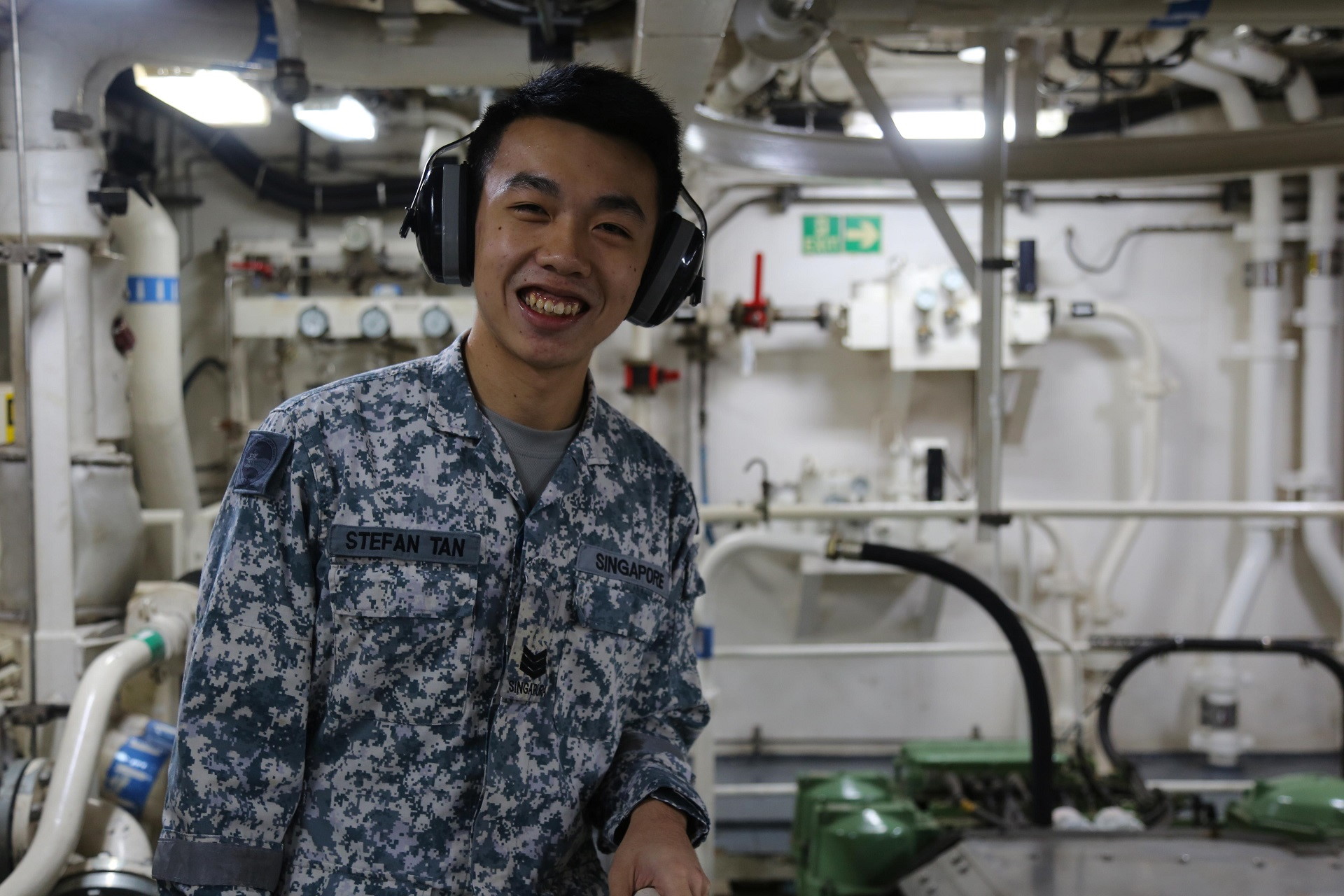 3SG Tan: Saya bertugas sebagai Operator Sistem Marin sebagai sebahagian daripada Jabatan Kejuruteraan yang menjaga sistem kejuruteraan. Sistem ini memainkan peranan penting dalam kebolehan kapal untuk bertempur dan bertahan di laut. Sistem ini merangkumi enjin dan gear steering yang menyediakan pendorongan, dan penjanaan air tawar.