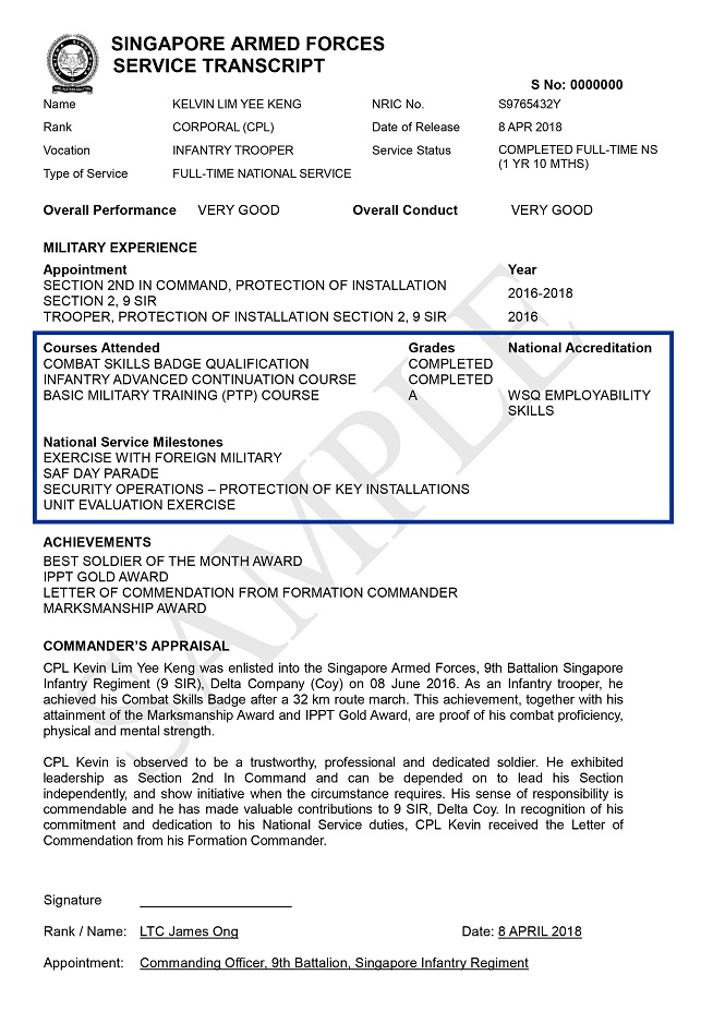 " COS ini akan mencerminkan kemahiran dan kecekapan yangNSF dapat semasa menjalani NS sepenuh masa, kerana ramai daripada NSmen kita telah memperoleh Kelayakan Kemahiran Tenaga Kerja semasa NS mereka dan ini patut dicerminkan supaya ia akan membantu mereka dalam pengajian selanjutnya atau mendapatkan kerja dan kareer baru selepas Perkhidmatan Negara Sepenuh Masa."
