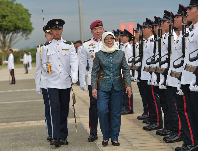 Bercakap pada majlis perarakan memeriksa perbarisan pegawai, Presiden Halimah Yacob menekankan peranan penting yang dimainkan oleh Angkatan Bersenjata Singapura (SAF) dalam berurusan dengan keganasan. Selain daripada membentuk pasukan petugas dengan tahap kesediaan yang tinggi, SAF telah bekerjasama secara aktif dengan Home Team dan mengambil bahagian dalam latihan ketenteraan serantau bagi meningkatkan usaha menentang keganasan.