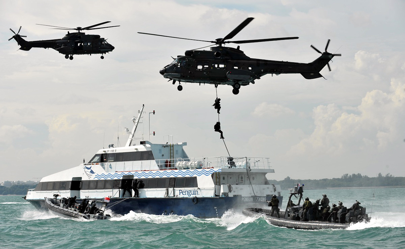 Two Patrol Vessels from the RSN, together with the Police Coast Guard and other vessels from national agencies intercepted the ferry. Overhead, Super Puma helicopters from the Republic of Singapore Air Force hovered as SOTF troopers descended and stormed the ferry. More troopers boarded from their fast boats and sealed off all escape points for the 'terrorists'.