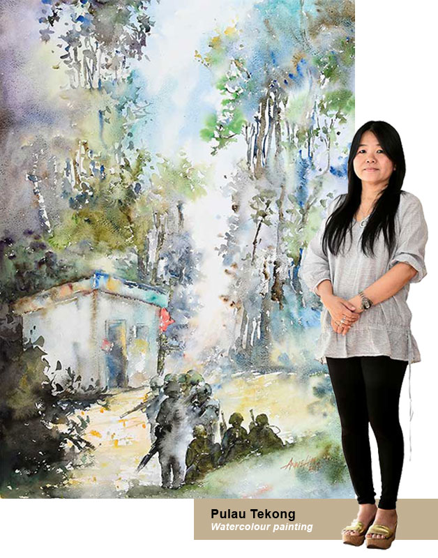 If there was a Chinese phrase that summed up what artists from the Singapore Art Society felt when they visited military camps over the last few months, it would be ???? (meaning "eye-opener"). In fact, they were so awed by the tough training which Full-time National Servicemen (NSFs) go through, that some of them expressed their feelings through calligraphy with said phrase during the visits. In this project initiated by the Society to commemorate 50 years of NS, 60 artists volunteered to draw, paint or sculpt a scene of the Singapore Armed Forces (SAF) from which they took inspiration. Camp visits were organised to give them a deeper understanding of what the SAF does. For example, they got to experience shooting with the Singapore Assault Rifle 21 at a simulator and observed recruits going through Basic Military Training (BMT) at Pulau Tekong. Lieutenant Colonel (LTC) Ang Ai Hua, who organised the visits, loved the idea of portraying NS through art. "The art scene is a community that we normally do not associate with the military. Through the eyes of the artists, we can bring out a softer and more beautiful side of NS," said the 45-year-old Head of NS Outreach and Engagement. "We hope that the art society can depict the military from an artistic, civilian perspective so that people can understand NS better." The art pieces will be exhibited at various venues from June to December for public viewing, beginning with the launch at ION Art Gallery (24 to 29 Jun). Other venues include The Arts House (2 to 15 Jul) and Suntec Singapore Convention and Exhibition Centre (30 Jul to 13 Aug). Members of the public who are interested in bringing a piece of NS50 art home can purchase them from the Singapore Art Society. Picture-perfect Love art? Here's a sneak peek at some pieces you can expect to see at the exhibitions! If I can go through it, so can you Oil painting WANG FEI, 45 MY INSPIRATION: When we went to the BMT Centre, LTC Ang gave a pep-talk to the recruits as they were very weary and drained from their training. She said something that inspired my painting -- "If I can go through it, so can you". The art piece showcases the bond of a female Regular encouraging recruits, and the camaraderie between them. Each of the 19 recruits has his own actions and expressions as a reaction to LTC Ang's words. After all, these recruits are just your average boys going through a rite of passage. Seeing them train so hard and knowing that they will become protectors of our country touches me deeply. Fearless protector Mixed media on canvas P. GNANA, 46 MY INSPIRATION: My inspiration comes from a soldier's strength. Through a collage of muted colours like black, green and grey and materials resembling the SAF uniform, I want to evoke feelings of the toughness of military life. As this is an abstract piece, it is up to the viewers to interpret what the piece is trying to portray. My works are usually focused on relationship themes and creating this piece was challenging. But just like how the soldiers use two years of their lives to train, I also wanted to step out of my comfort zone and take a different approach to bring out the resilience of SAF soldiers. French horn player Pastel colour painting SIO SIT MIN, 70 MY INSPIRATION: When I visited Nee Soon Camp and saw the SAF Band rehearsing, I was intrigued by the bold colours of their uniforms. I took lots of pictures during their performance and narrowed it down to a French horn player from the band. I felt that the splashes of red, white and gold bring out a softer side of the SAF -- one which the public does not usually associate the military with. On another note, I thoroughly enjoyed myself during the camp visits as I never knew that the SAF had so many departments and units. My most memorable visit? BMTC, as the beginning is always the toughest and I could see the young recruits giving their all to train. Pulau Tekong Watercolour painting ANNE LIM, 52 MY INSPIRATION: As I'm a scenery painter, I was very inspired by the lush greenery in Pulau Tekong. This painting is based on the scene where recruits were resting while waiting for their turn to train. Although the colours in Tekong are largely green, I decided to add tinges of blue in the painting to exude a cooler touch. I hope that when recruits look at my art piece, they will see a different perspective of serving NS. Training may be tough, but sometimes, all it takes is an adjustment of mindset. Just pause and look at the lush greenery, and you may not be so vexed about having to go through NS. |