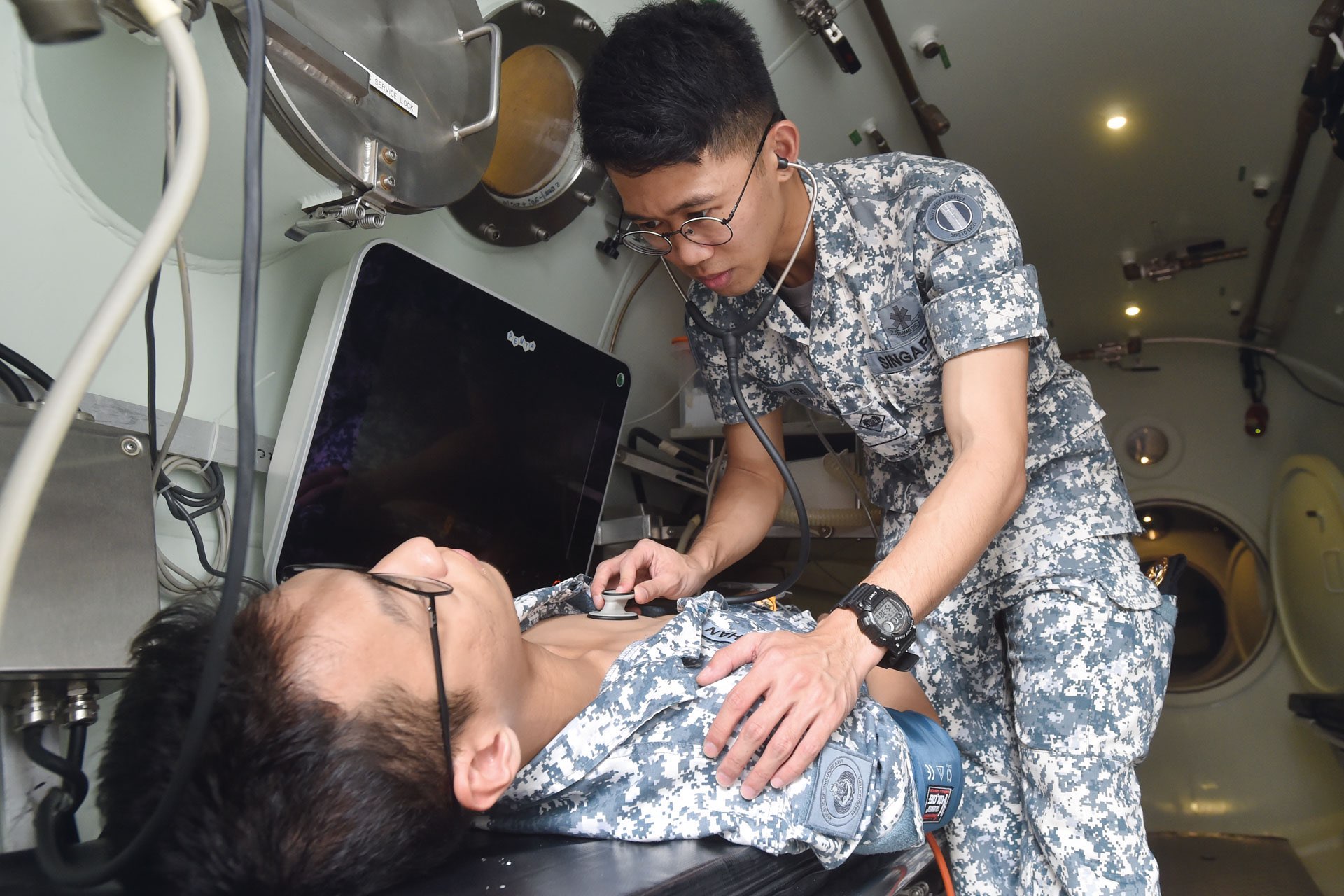 It's just a day in the life of a Republic of Singapore Navy's Underwater Combat Medic (UCM). Their speciality is hyperbaric medicine, where they are trained to treat DCI patients by "diving" with them in the hyperbaric chamber, which simulates the pressure of varying depths below sea level.