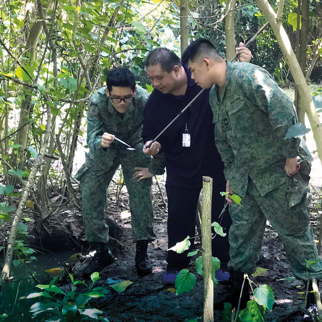 - BDFC personnel checking for mosquito larvae in malaria-receptive areas in Pulau Tekong.