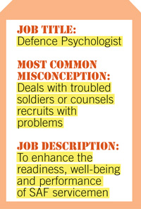 "One of the most common things people initially assume when I tell them about my line of work is that I deal with troubled soldiers or counsel recruits with problems," said defence psychologist Lin Yinghan.