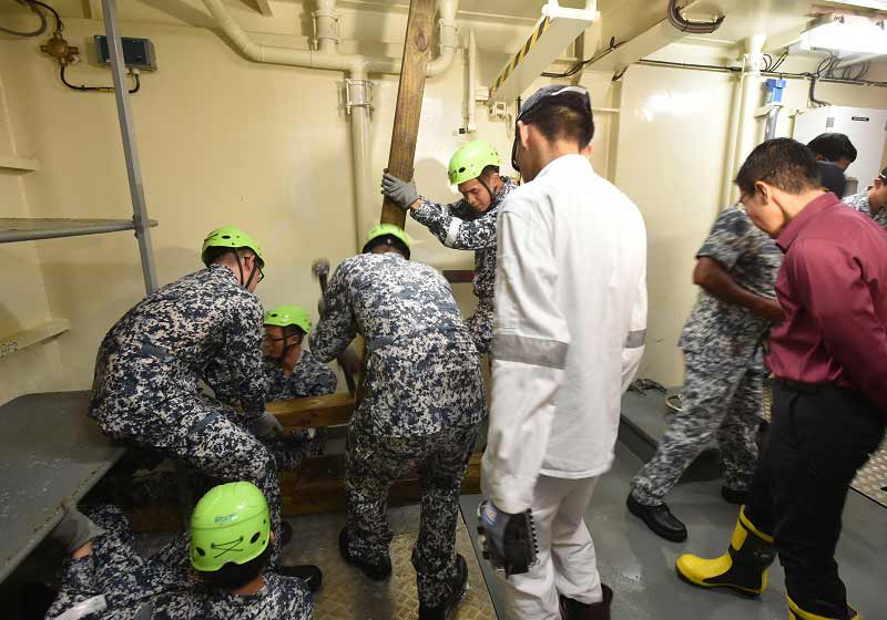At the Damage Control Trainer, Dr Maliki watched trainees contain the flooding of a ship in a simulated scenario.