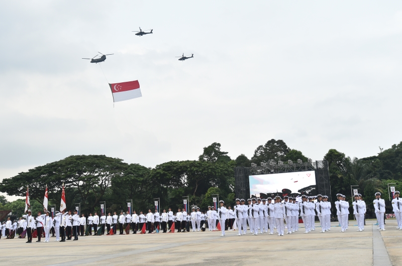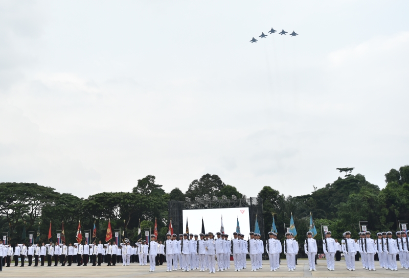 Five F-15SG fighter planes performed a flypast to pay tribute to all regulars and national servicemen - past and present. Also featured was a heli-flypast of the national flag.