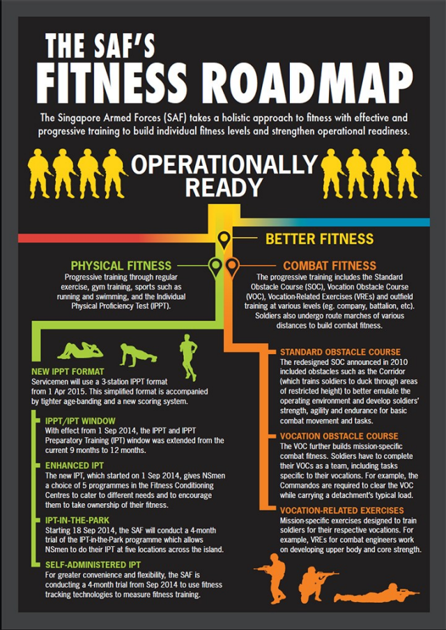 In 2010, the SAF revised the combat fitness training system with the introduction of Vocation Related Exercises, Vocation Obstacle Course and a redesigned Standard Obstacle Course.