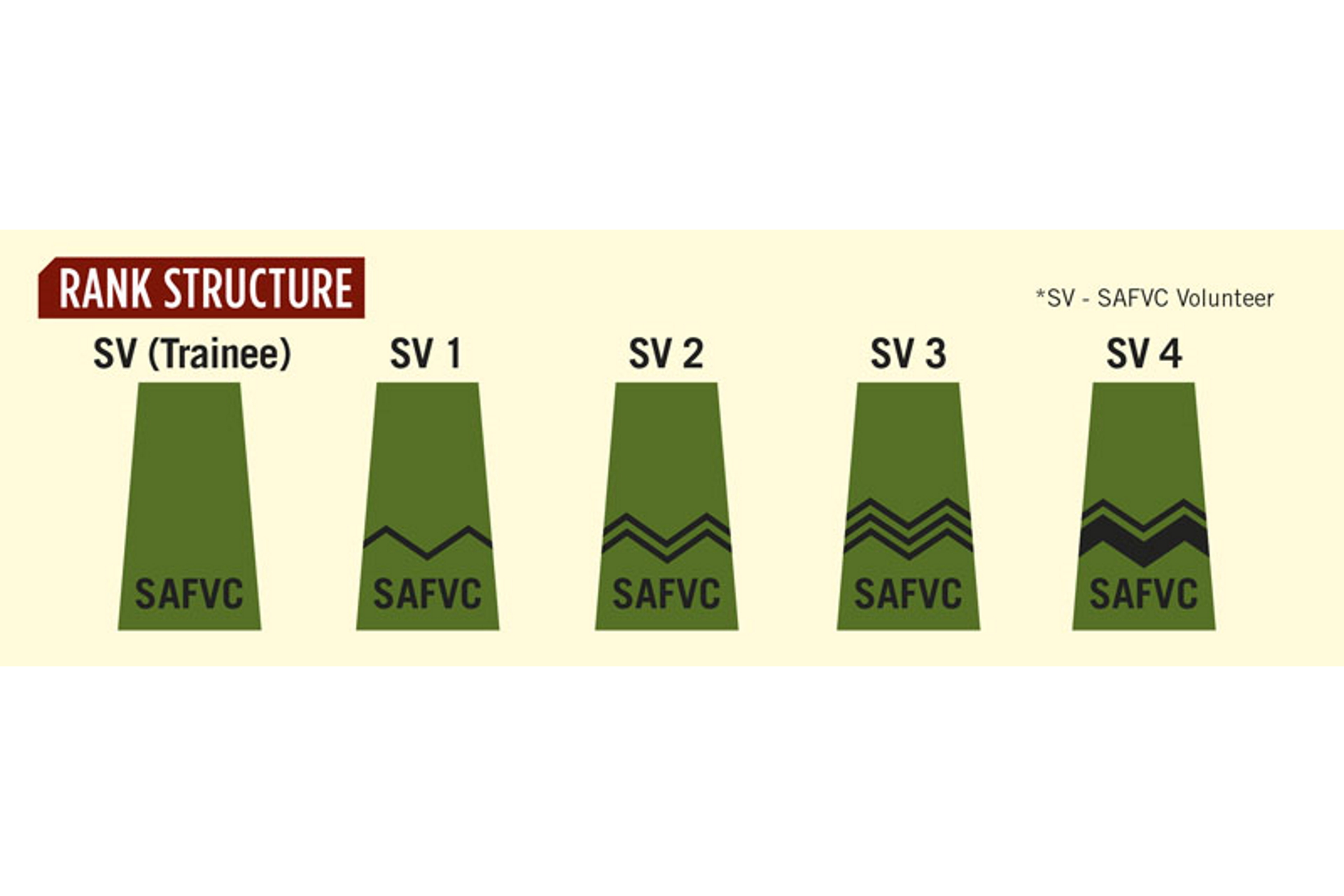 Terdapat lima pangkat dalam SAFVC (yang tidak ditambat pada struktur pangkat SAF). Selepas penamatan latihan asas dan kelayakan, SV (Pelatih) akan dinaikkan pangkat kepada SV1.