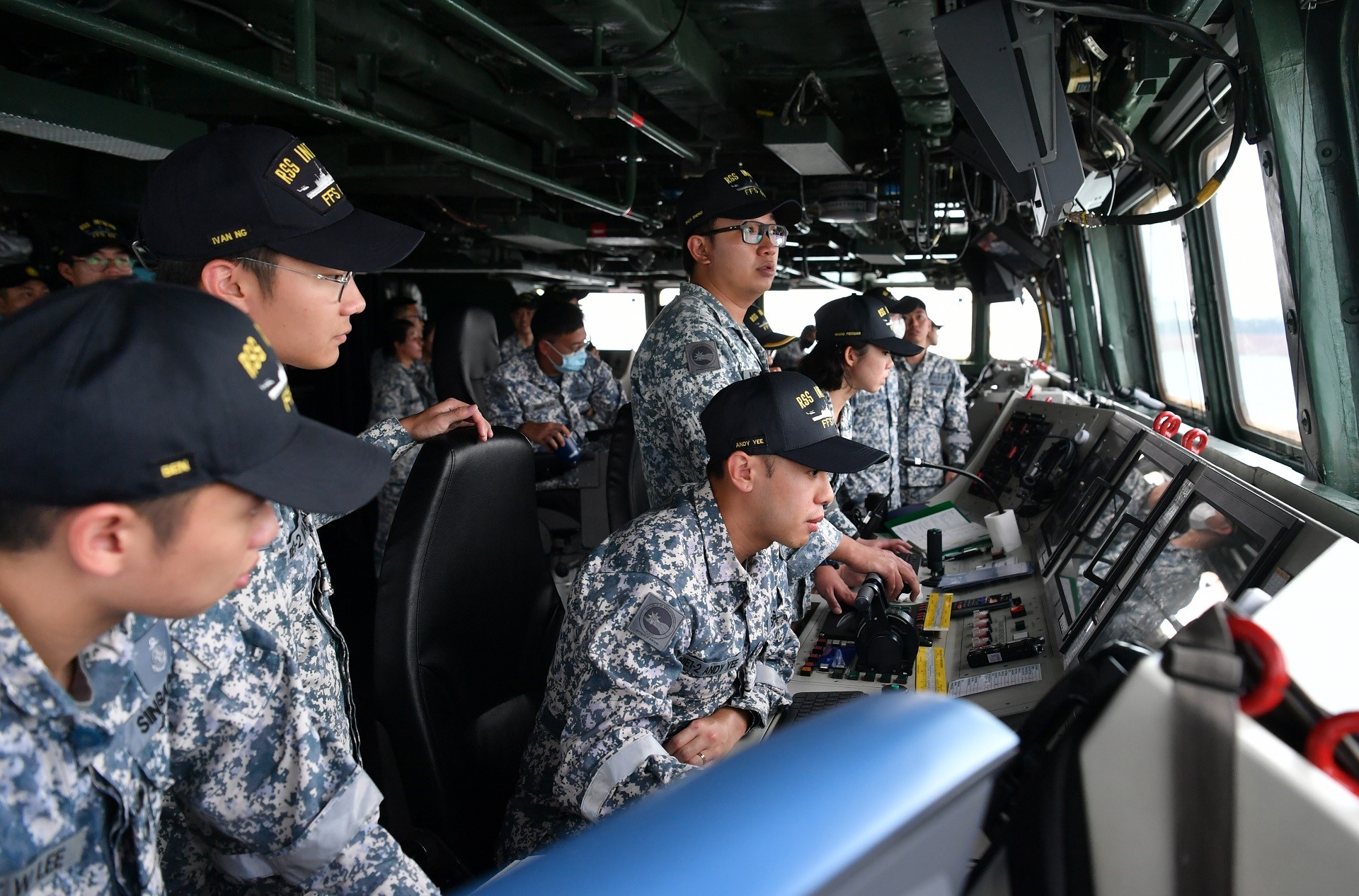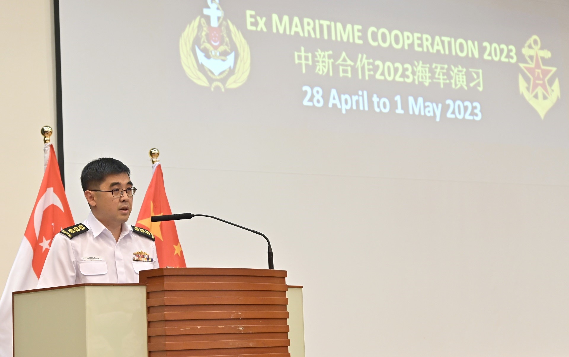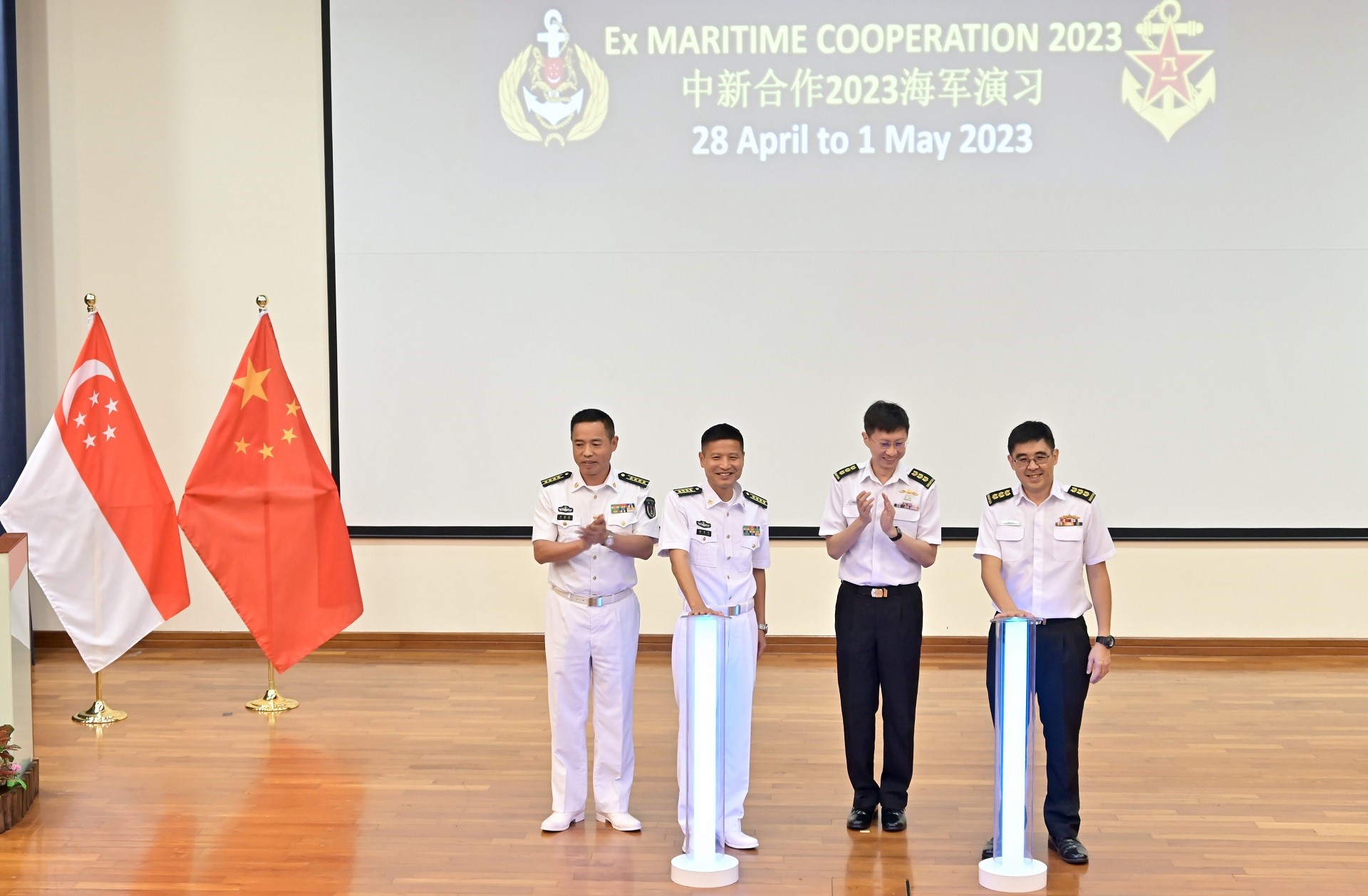 Pada 28 Apr, Panglima Flotilla Pertama Kolonel (KOL) RSN Daniel Ng (kanan sekali) dan Ketua Staf Flotilla Pemusnah PLA(N), Perintah Teater Selatan, Kapten Kanan Mei Leyang (dua dari kiri) merasmikan bersama Majlis pembukaan Kerjasama Maritim Latihan di RSS Singapura – Pangkalan Tentera Laut Changi.