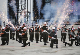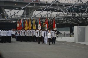 To commemorate 45 years of National Service (NS45), spectators in and around the floating platform were also treated to a 10-minute Salute to NS45. Comprising land, air and sea elements, the salute began with 2,000 parade participants marching 10 steps forward in the Advance-in-Review-Order parade drill.