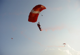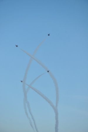 Then came the crowd favourite - the Red Lions - which had spectators craning their necks, waving their flags and pointing their cameras towards the sky as they tried to spot the six members of the freefall display team. Sporting red smoke trails that trailed their descent from 10,000 feet, each of them landed on the floating platform smoothly to the applause and delight of spectators.