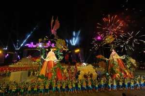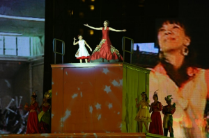 In Act Three, the stage was transformed into a garden, with life-sized butterfly and dragonfly props as well as performers on stilts. But the highlight was when participants came together to form a giant heart using pyrotechnics as fireworks lit up the night sky.