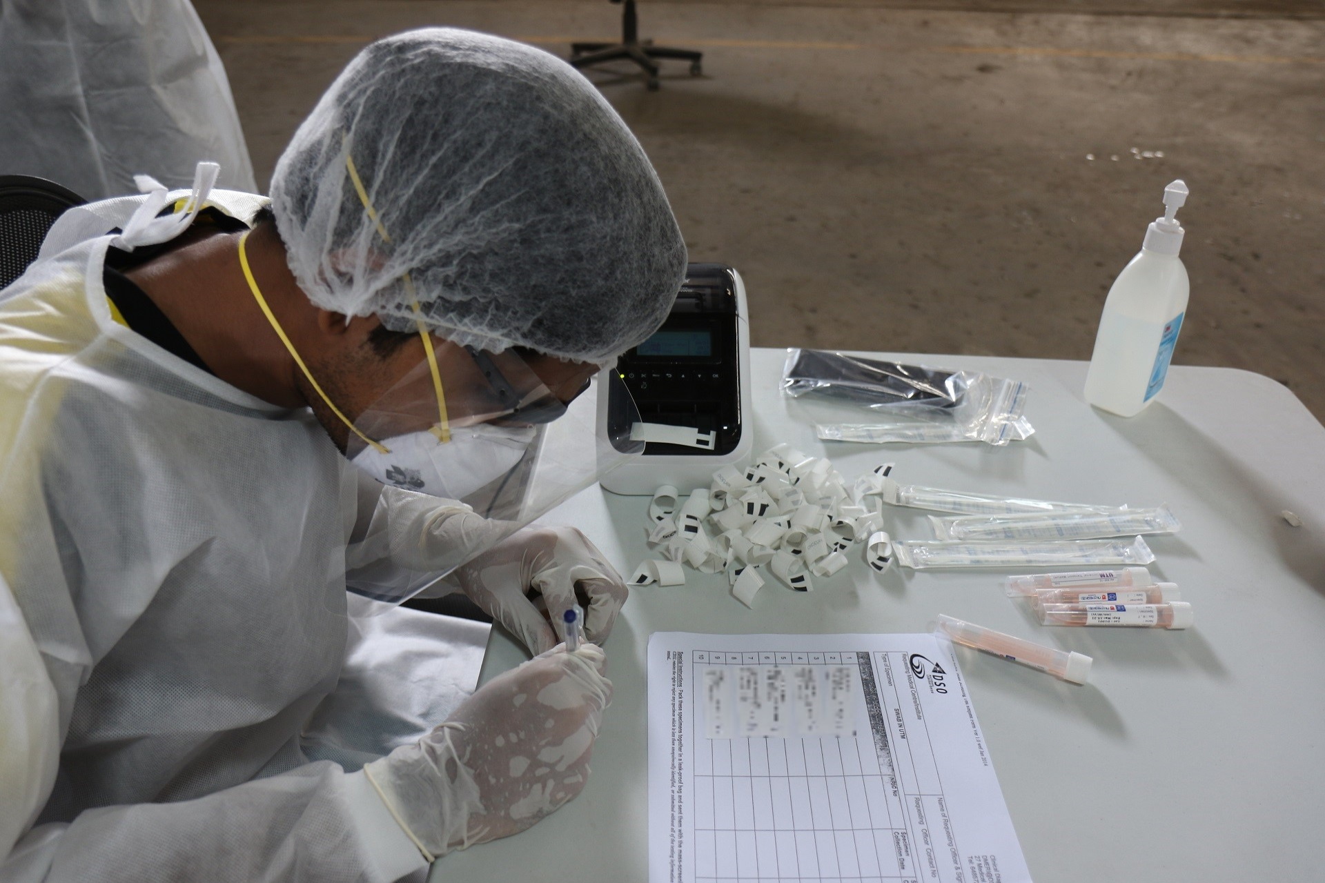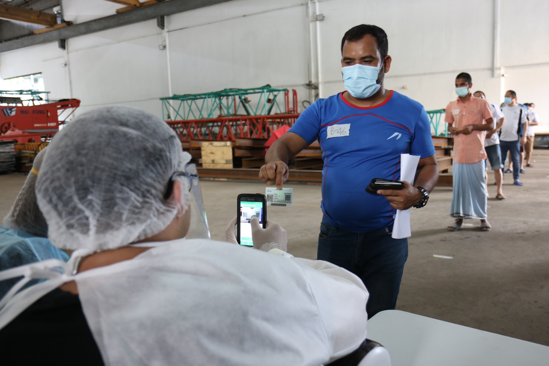 Pekerja asing yang menjalani ujian swab mengimbas dokumen pengenalan mereka dahulu di kaunter pendaftaran. Butiran peribadi mereka, seperti nama dan tarikh lahir, terus dikemaskinikan di aplikasi MExS.
