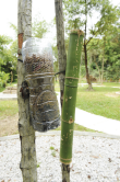 A piece of bamboo filled with layers of grass, sand, pebbles, stones and charcoal is used to purify water. The plastic bottle on the left displays how the filtering layers look like.