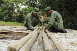 3SG Ng (left) and 3SG Lim tying the poles of a tepee shelter together with vines.