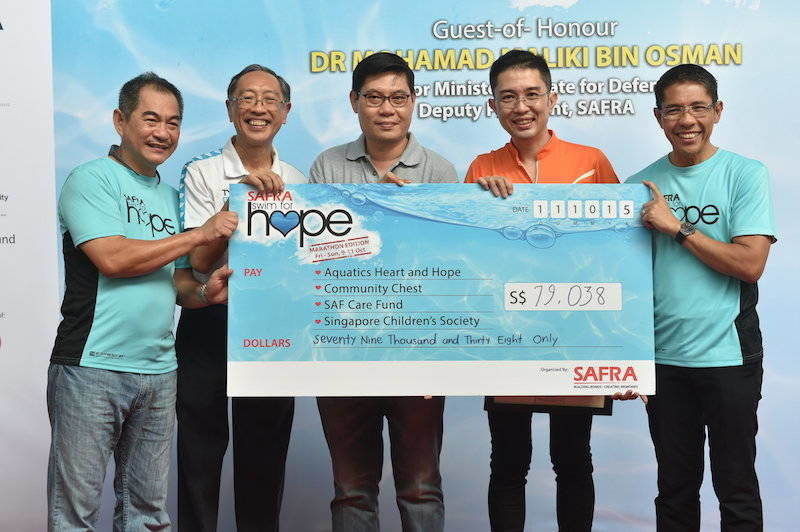 Senior Minister of State for Defence and Deputy President of SAFRA, Dr Mohamad Maliki Bin Osman, was at the event finale held at SAFRA Tampines on 11 Oct. He presented prizes to the top 10 swim marathoners who swam the most laps, and also presented the cheque to the four beneficiaries.