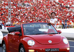 At this year's parade, Volkswagen Group sponsored six shiny red and white new Beetle Cabriolets that were used to transport the six NDP emcees onto the Padang during the pre-parade segment.
