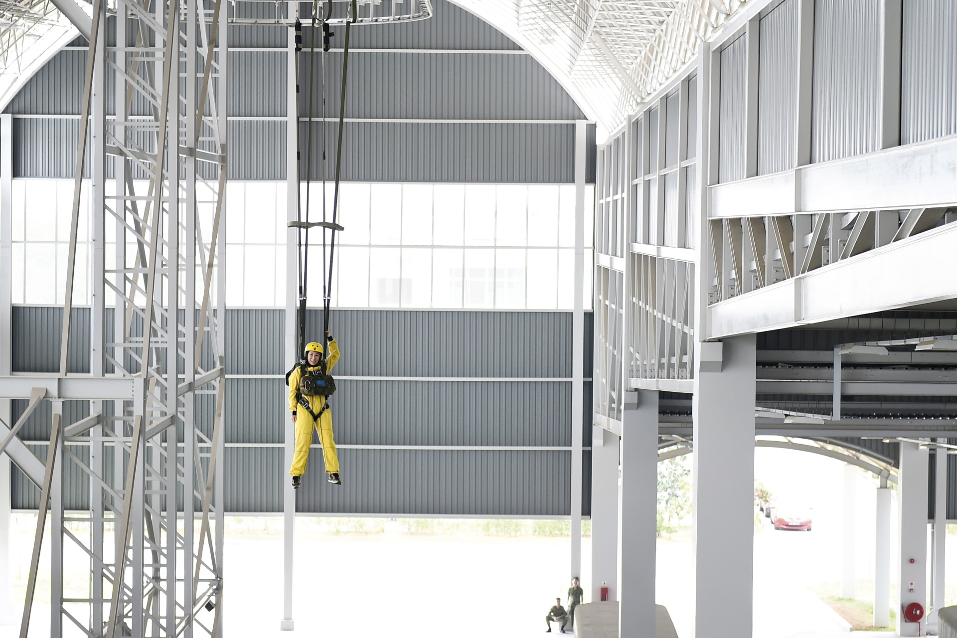 The Rotational Trainer System (RTS) is the second stage, where trainees practise controlling the parachute by pulling the toggles according to the wind direction, and learn how to untangle their parachute in mid-air.