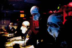 MAJ Chan (above) in the Combat Information Centre of an LST during his deployment to the Northern Arabian Gulf, and him (below, fourth from the right) together with his US Navy counterparts there.