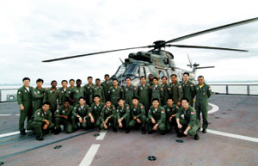 MAJ Ong (front row, third from right) and his Super Puma squadron mates on board a RSN Landing Ship Tank during a joint operation.