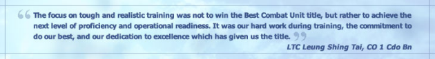 "It is our people who make the difference. Their level of motivation, desire to excel, ability to take hardship and determination to go beyond their limits are the things that set 1 Cdo Bn apart from the rest," said Lieutenant-Colonel (LTC) Leung Shing Tai, Commanding Officer (CO) 1 Cdo Bn.