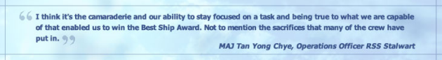 An ability to stay focused on their mission and the desire to be the best were the two traits that won frigate RSS Stalwart the Best Ship title. Staying true to their ships motto "Determined to Win", the sailors proved their mettle in the United States.