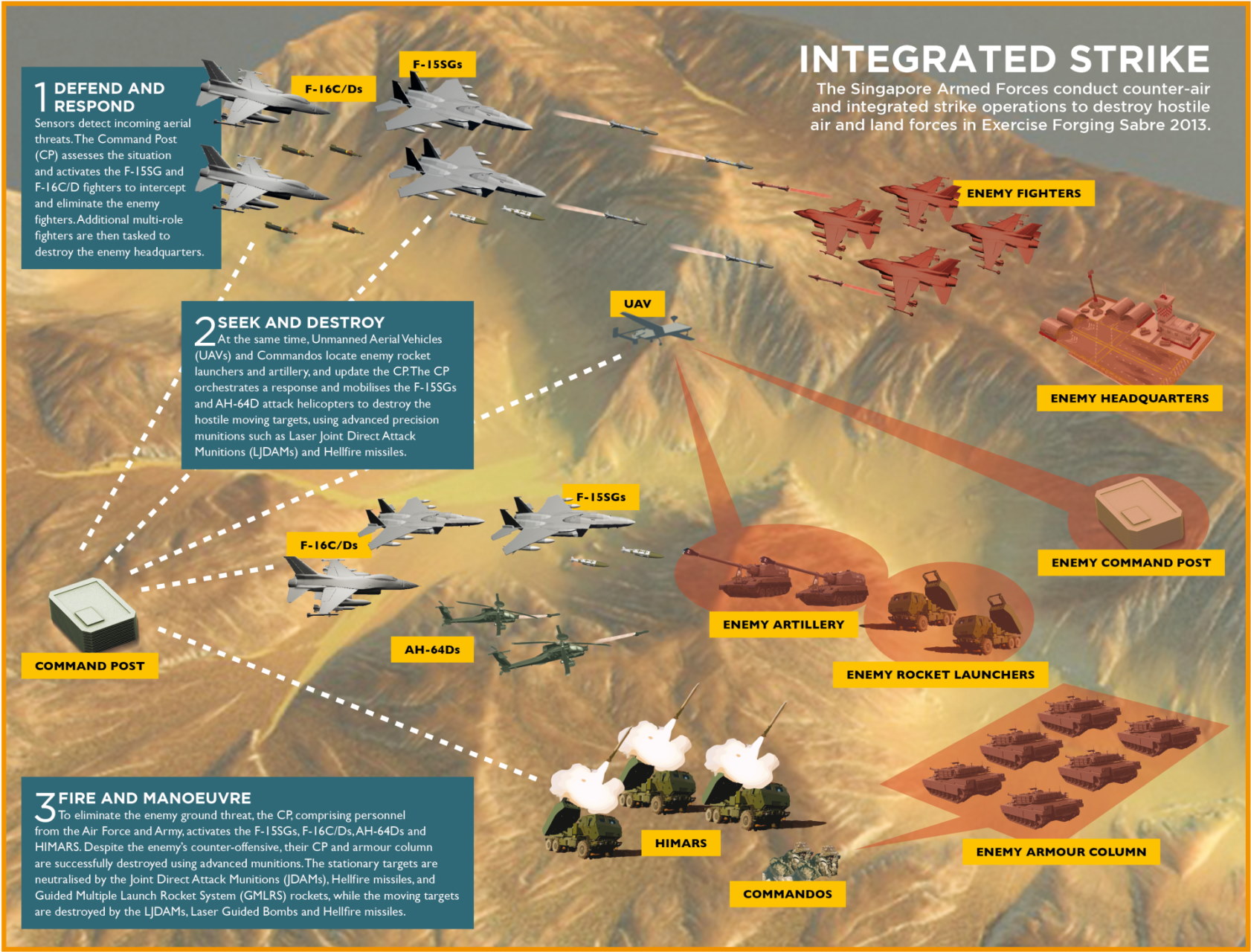These munitions enable the SAF to engage a variety of targets, moving or static. In the exercise, F-15SGs armed with LJDAMs and AH-64Ds with anti-tank Hellfire missiles were deployed to destroy a simulated enemy armour column on the move.
