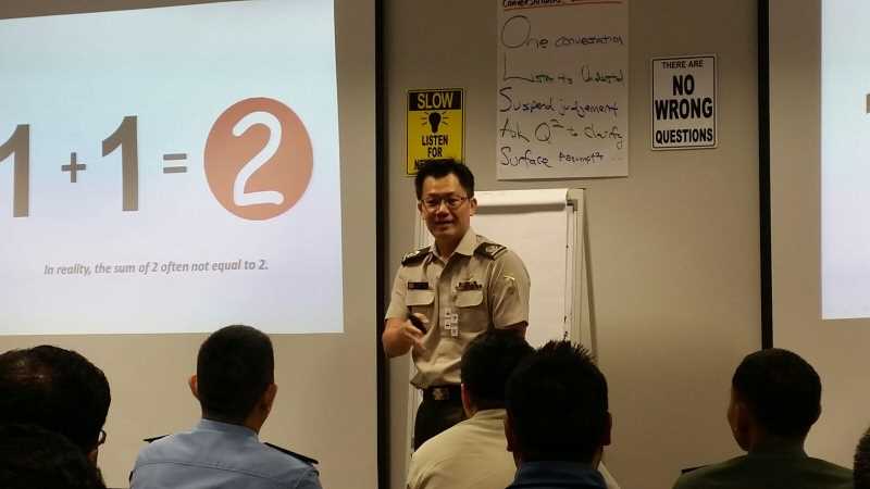 The programme, held at the RBAF Defence Academy in Brunei, was facilitated by Deputy Head CLD Senior Lieutenant Colonel (SLTC) Daniel Siew and his staff officer 1st Warrant Officer (1WO) Jerry Soh. It was designed to introduce approaches to becoming effective military leaders. Head CLD Colonel (COL) Fred Tan joined the team on the third day of the programme to share his reflections on Command and Command Philosophy.
