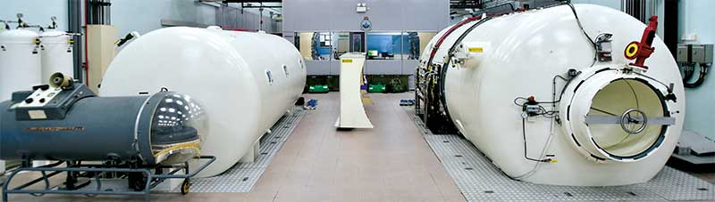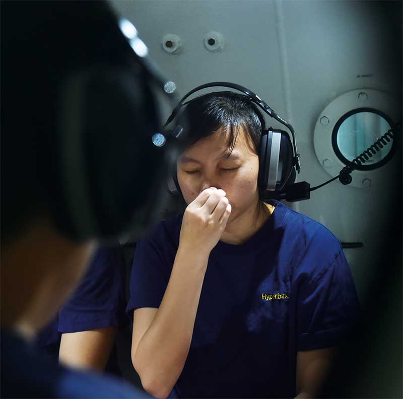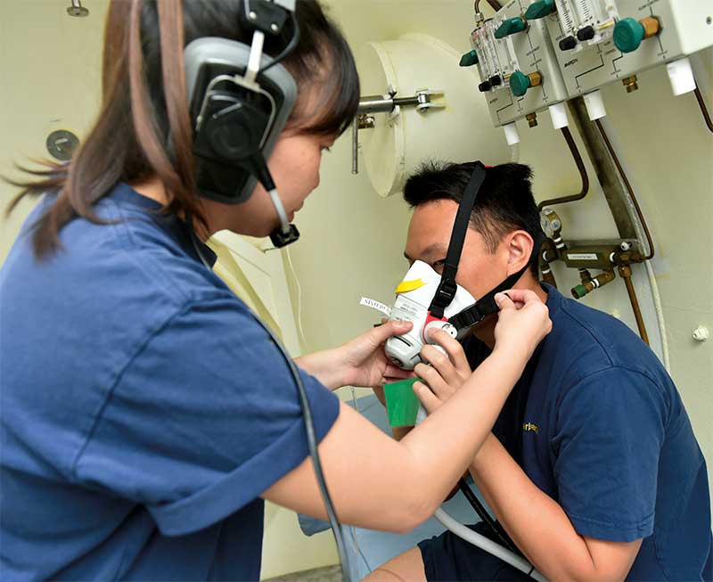 Except that no one's actually getting wet. Air is pumped into the airtight cylinder to simulate a 10m dive underwater. Hyperbaric attendants, who accompany patients in the chamber for treatment, must be able to withstand the pressure changes of "diving" down and back up.