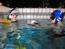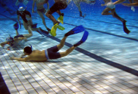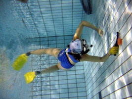 To jump-start my foray into the sport, Samuel gave me a short tutorial on the easiest method to dive to the bottom of the pool. Basically, while swimming on the surface, I should tuck my head down and bend my body at the waist about 90 degrees and fin my way to the bottom.