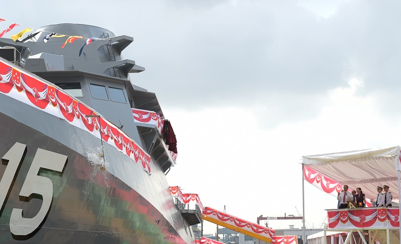 The Republic of Singapore Navy (RSN) commemorated the launch of its newest ship, the first Littoral Mission Vessel (LMV), Independence. Held at the Singapore Technologies Marine (ST Marine) yard on 3 Jul, the launching ceremony was officiated by Minister for Defence Dr Ng Eng Hen. The LMV was launched by Mrs Ivy Ng, wife of Dr Ng.