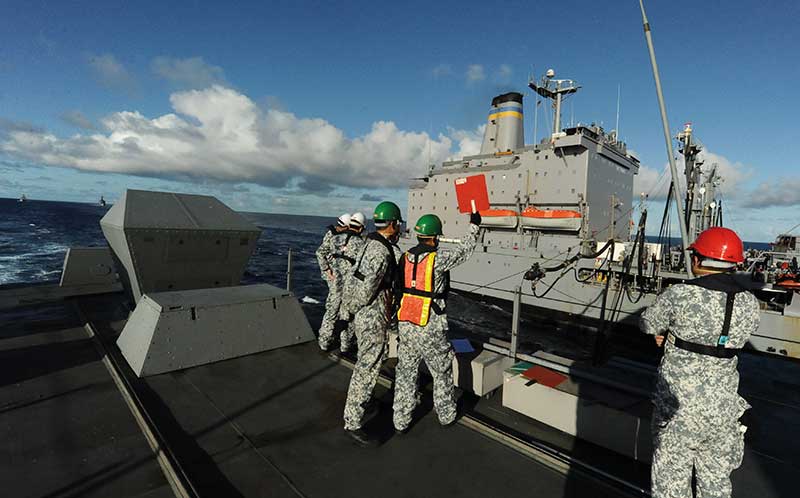 Replenishment out at sea is a risky manoeuvre, as ships can collide when passing close to each other, due to a natural phenomenon called the Bernoulli effect. The low pressure area created when the two ships move closer together sucks them towards one another. To counter this effect, the ships have to steer slightly away from each other while making sure that they are close enough for the re-fuelling line to remain connected - a delicate operation, to say the least.