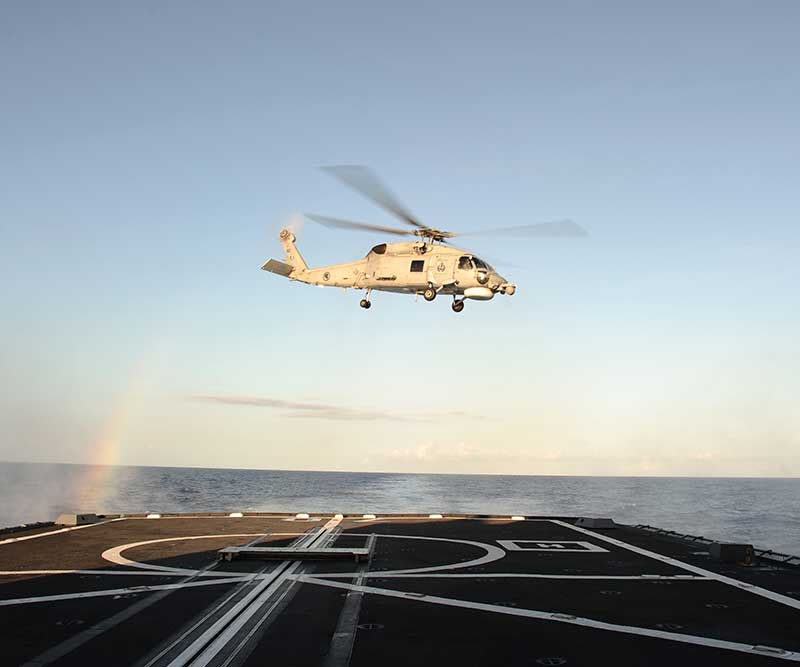 Two RSAF pilots, an RSN TACCO and a Sensor Operator operate the S-70B helicopter together.
