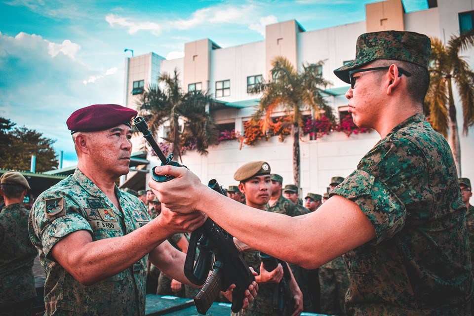 A recruit receiving his Singapore Assault Rifle (SAR) 21 in a ceremony during the first week of BMT. A rifle is a deadly weapon that can only be entrusted to a responsible person. Hence, when a recruit gets his rifle, it is a pivotal moment that marks his transition from boy to man.