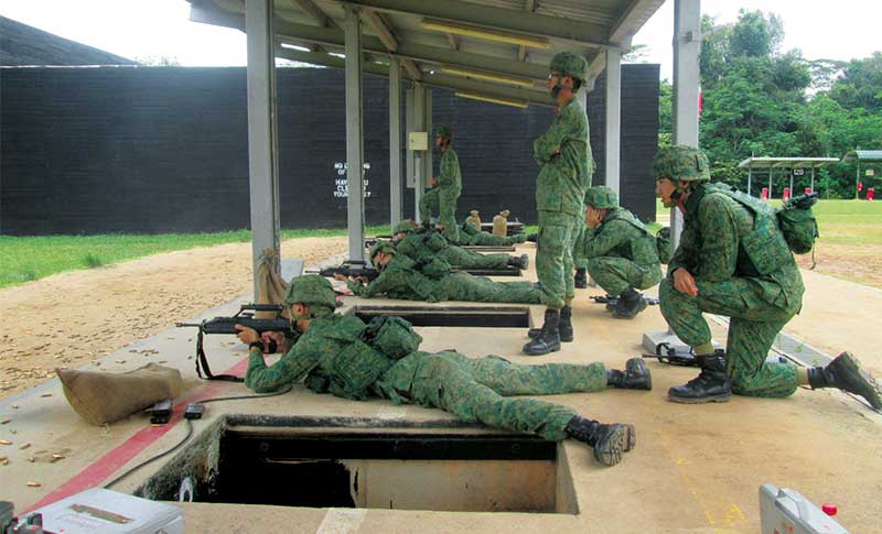 Recruits practise firing their SAR 21 using "live" rounds at an outdoor range. This is done after their simulation shooting practice at the Individual Marksmanship Trainer.