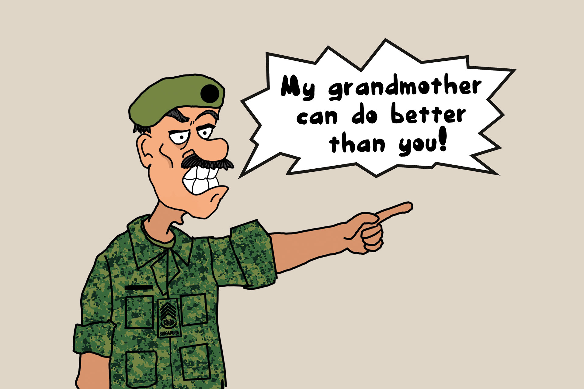Think you're finally getting a break from your Asian Dad in National Service (NS)? Afraid not, buddy. This guy will beat you down with his sky-high expectations. You're likely to hear comments like: "You got Gold for your Individual Physical Proficiency Test? With 98 points? That's not 100! My grandmother can get full marks!"