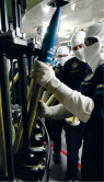 The midshipmen loading the 76mm rounds into the rotating belt of the gun.