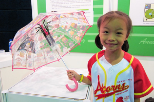 The six-year-old has invented a 'cooling umbrella', which uses a simple system of plastic straws, thread and a water container to cool the area beneath it.